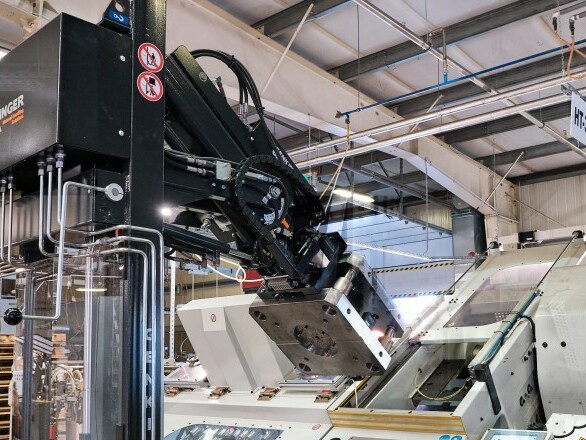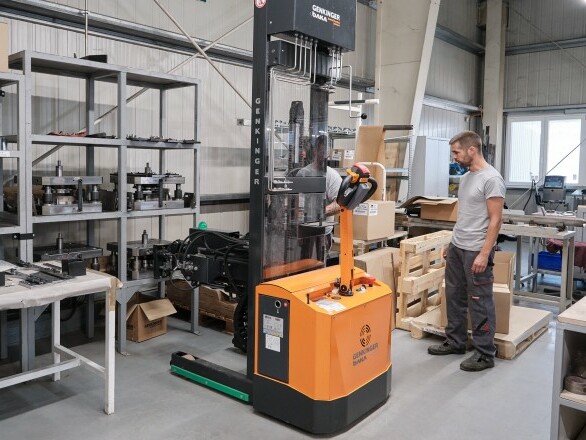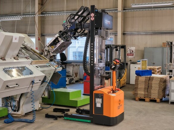 Ein Unternehmen der Verpackungsindustrie wechselt 350 kg schwere Werkzeuge mit einem Genkinger Gerät. In einem Winkel von 60° bringt es die Werkzeuge in eine Stanzmaschine ein. Da das Werkzeug nach dem Gebrauch sehr heiß ist, kann es nicht mit Händen angefasst werden. Eine Einfahrschiene am Boden sorgt dafür, dass das Fahrzeug am richtigen Platz steht. Ein digitaler Winkelmesser unterstützt bei der Aufnahme der Werkzeuge. Das Flurförderzeug legt die Werkstücke auch in einem Regal mit über 2 m Höhe ab. Der Footprint liegt nur bei 1,36 qm, der Carbon Foot- print ist durch Langlebigkeit des Gerätes ebenfalls nicht groß.