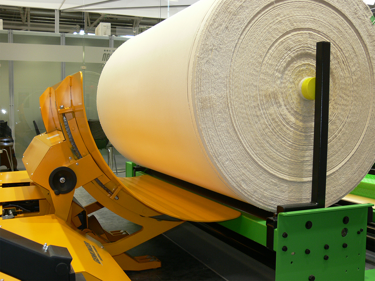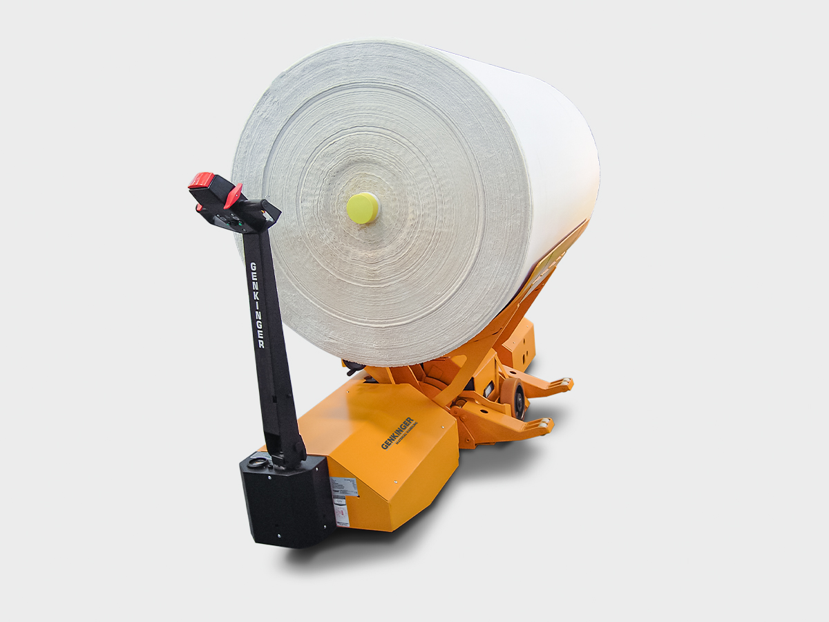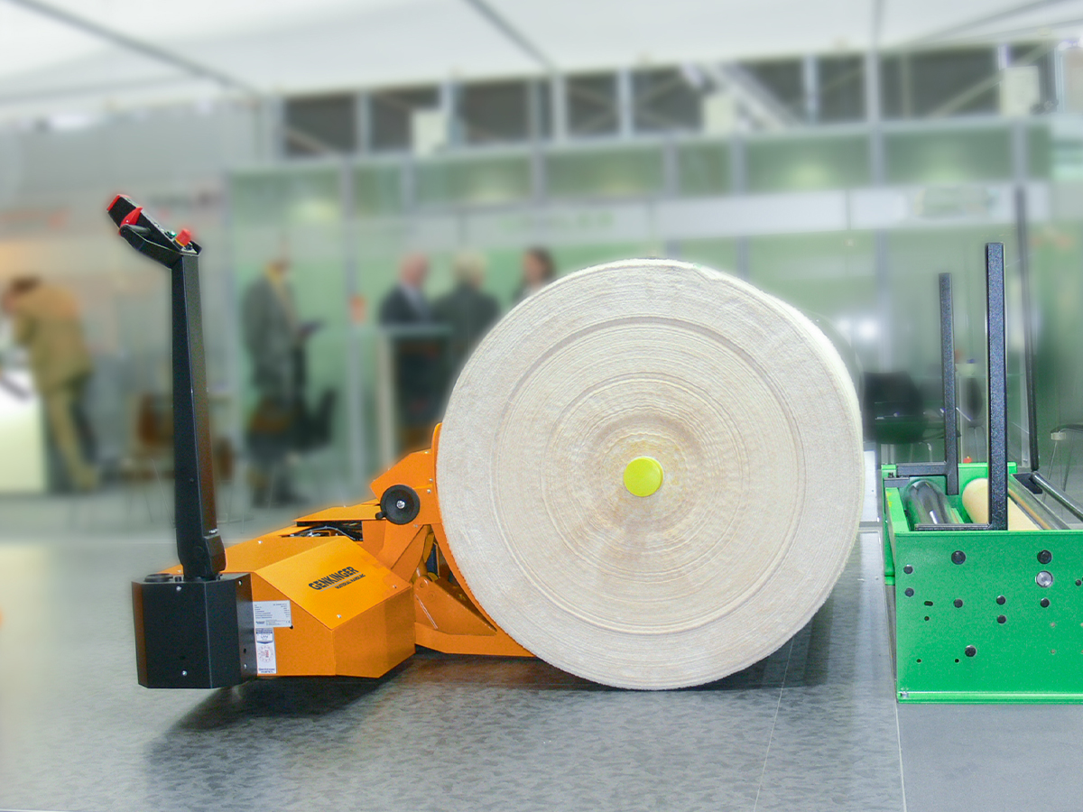 Der EE-DKHUM Kettbaum- und Dockentransportwagen ist der universelle Helfer rund um die Webmaschine. Docken und Kettbäume lassen sich mit nur einem Gerät zuverlässig und effizient bewegen.