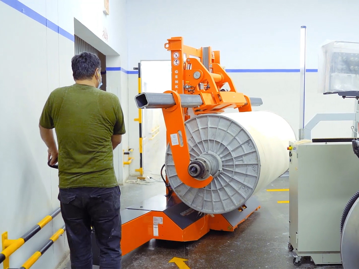 Das schmale Fahrwerk und der kleine Wenderadius des EE-KHHR ermöglichen ein präzises und sicheres Manövrieren in engen Gängen und beengten Arbeitsbereichen. Damit transportieren Sie Kettbäume selbst in anspruchsvollen Umgebungen, mit Platzproblemen.