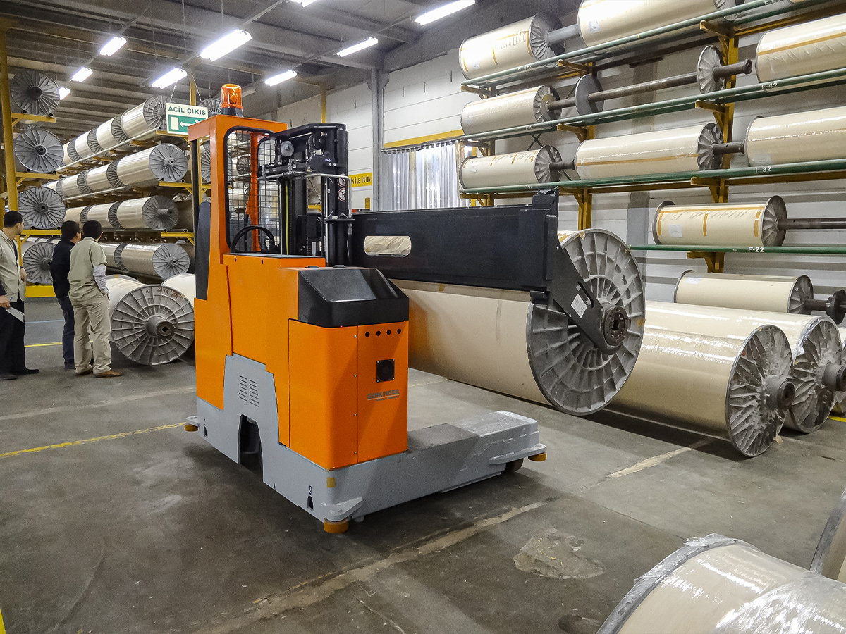 Unser Elektro-Mehrwege-Seitenstapler EE-MSR wurde speziell für den sicheren Transport schwerer Kettbäume bis 7 Tonnen entwickelt. Durch seine Mehrwege-Fahrfunktion lässt sich der Stapler seitlich in alle Richtungen manövrieren – perfekt für Schmalganglager, enge Lagerlayouts und hohe Regale.
