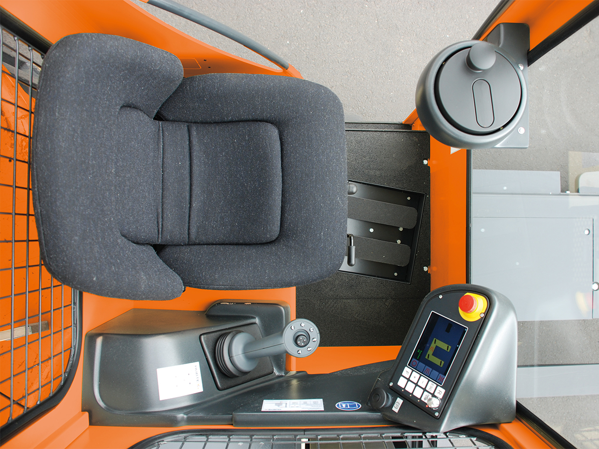 Die ergonomisch gestaltete Fahrerkabine bietet beste Rundumsicht und sorgt durch den komfortablen Fahrersitz für eine angenehme Arbeitsumgebung. Ein intuitiver Joystick ermöglicht die präzise Steuerung aller Fahrzeugfunktionen. Der zentrale LED-Monitor liefert alle wichtigen System- und Betriebsdaten auf einen Blick – für maximale Transparenz und Kontrolle im Arbeitsalltag.