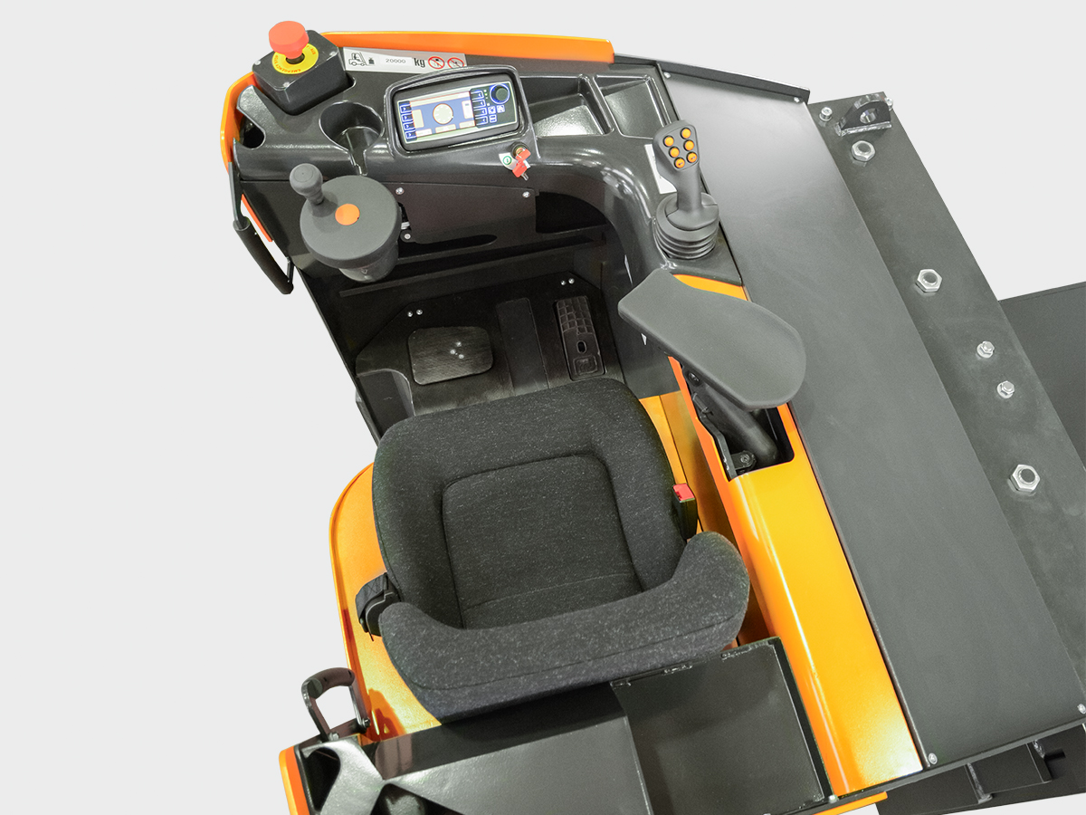 Der Bedienplatz ist auf Komfort und Sicherheit ausgelegt: Mit Fahrersitz, Lenkrad, Multifunktionsdisplay, Joystick, Fahrpedal und Sicherheits-Fußschalter hat der Fahrer alle Funktionen ergonomisch im Griff – für präzises, effizientes und sicheres Arbeiten.