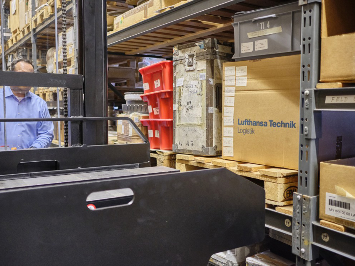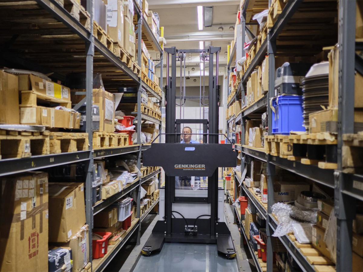 Die Lufthansa „fliegt“ auch im Ersatzteillager in Hamburg hoch hinaus. Wie überall in der Luftfahrt spielt das Gewicht auch hier eine große Rolle. Ein Standard-Regalbediengerät wäre für das Gebäude schlicht zu schwer gewesen, und so tüftelten die Spezialisten von Genkinger eine leichte und dennoch effiziente Lösung aus. Das Fahrzeug arbeitet jetzt bei Lufthansa Technik in der dritten Etage des großen Lagers. Es sorgt dafür, dass dringend benötigte Ersatzteile dringend schnell zum Versand gelangen. Führungsrollen halten das Fahrzeug in einem nur 1.300 mm breiten Gang auf Spur. Um die richtige Position zu finden, bevor die Teleskopzinken die Palette ein- oder auslagern, sind rechts und links an der Lastaufnahme Positionslaser angebracht. Eine Signalleuchte zeigt an, wenn die Palette sich außerhalb der Gerätekonturbefindet und die Fahrt fortgesetzt werden kann.