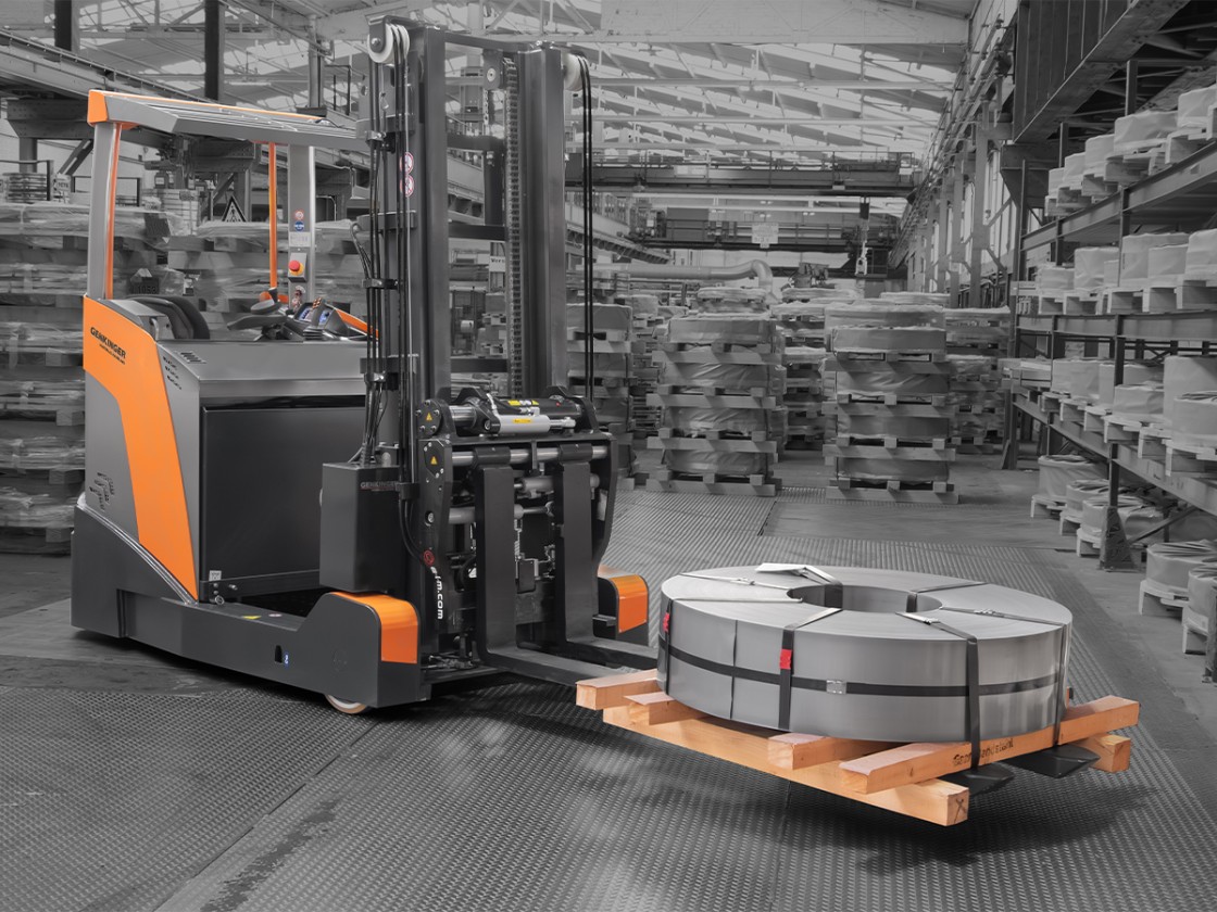 Ein EFSM-Schwerlaststapler transportiert 5.000 kg schwere Stahlcoils bis 3.000 mm Hubhöhe. Mit hydraulisch teleskopierbaren Gabelzinken können zusätzlich 2.000 kg bei größerem Lastschwerpunkt gehoben werden – ideal für das effiziente seitliche Beladen von LKW.