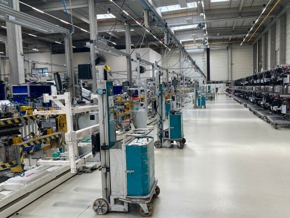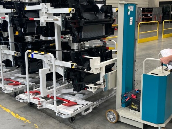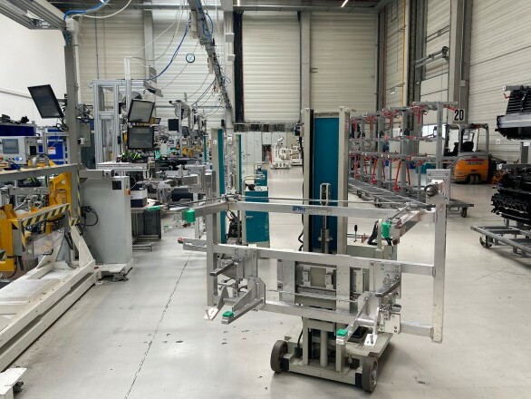 Ein Automobilzulieferer nutzt in seinem Werk seit Jahren manuelle Genkinger Geräte für den Transport von PKW-Frontsegmenten. Die Geräte nehmen am Ende des Herstellungsprozesses die fertigen Güter und setzen diese in Transportgestelle. Danach verlassen die Güter die Produktionsstätte „just in sequence“ zu den nahegelegenen Automobilwerken. Die Traglast beträgt 100 kg, der Hub erfolgt elektrisch. Verschiedene Endschalter helfen bei der Positionierung der empfindlichen Last. Der ermüdungsarme Betrieb ist durch die gewichtsparende Konstruktion gewährleistet.