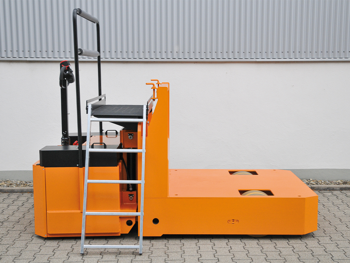 Der 17 to Niederhubwagen dient dem Transport von Spritzgusswerkzeugen, die mittels Kran aus den Maschinen genommen werden. Unser Kunde hatte das Problem, dass die Bediener zum Lösen des Hakens waghalsig auf das Werkzeug kletterten, weil die zur Verfügung gestellten Leitern nicht immer sofort vor Ort bereit waren. Die Lösung ist eine einfache, jedoch sichere Plattform mit angebauter, ein- und ausschiebbarer Leiter. Mitarbeiter und Berufsgenossenschaft sind begeistert, denn der Werkzeugtransport verläuft nun deutlich sicherer. Besonderheiten: