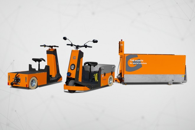 Der Elektro-Transporter SHERPA transportiert Werkzeuge und mittelschwere Teile in die Produktion. Inzwischen hat Genkinger diese Baureihe, u.a. durch Anhänger modular erweitert.