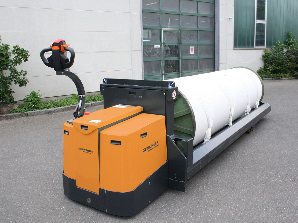 Der motorisierte Kettbaumtransportwagen KEGU von Genkinger ist die ideale Lösung für den sicheren, kraftsparenden und komfortablen Transport von Zettelbäumen, Vollkettbäumen und Halbkettbäumen – egal ob zwischen Schererei, Weberei, Kettvorbereitung oder Lager.