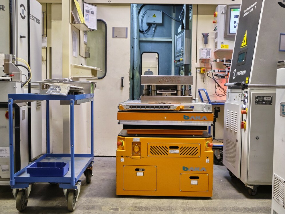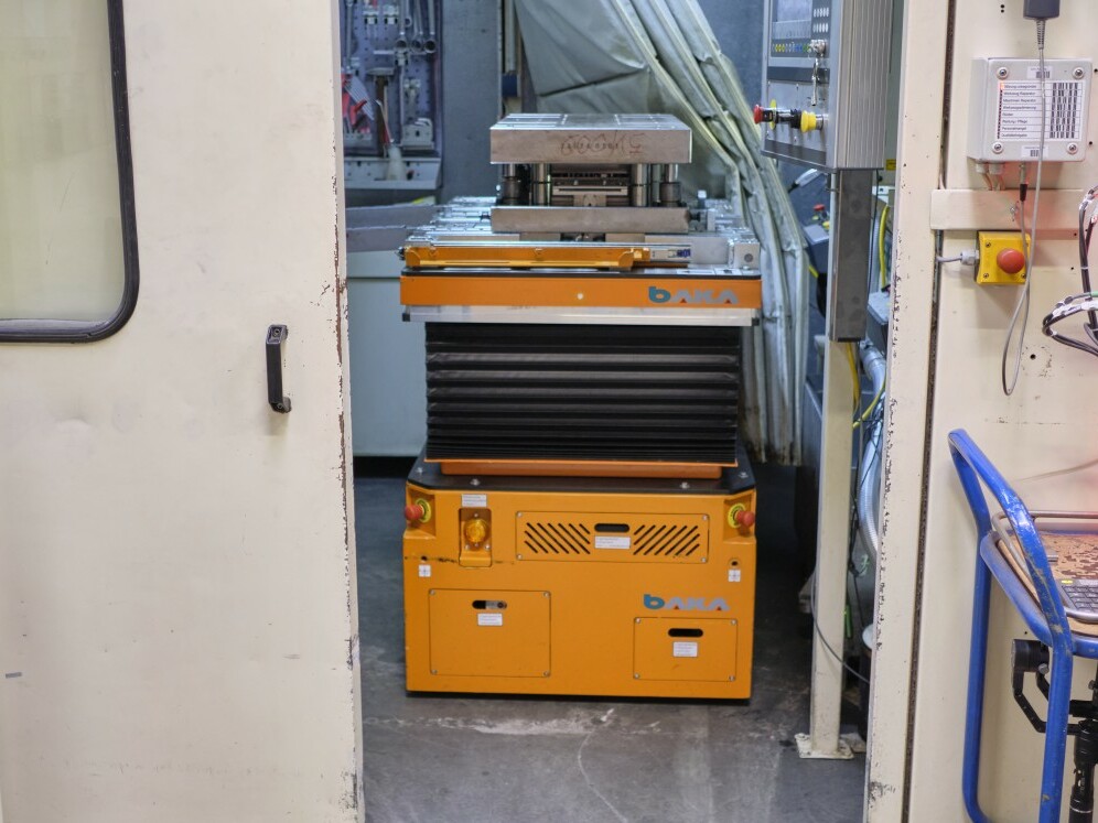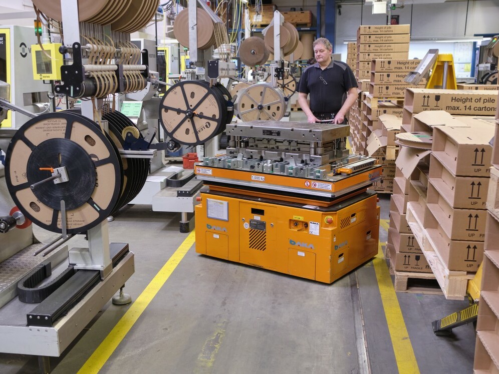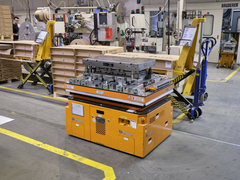 Wachsende Produktvielfalt brachte einen Hersteller von Steckverbindungen dazu, Lagerung, Transport und den Wechsel seiner Werkzeuge zu überdenken. Die Werkzeuge auf Hubtische zu legen und per Muskelkraft in die Stanzmaschinen zu schieben, erschien nicht mehr zeitgemäß. Eine Herausforderung war jedoch, dass die Zugänge zu den eng eingehausten, schallabsorbierenden Stanzautomaten lediglich 1 m breit sind. Gemeinsam mit Genkinger wurden zwei Mehrwege-Plattformwagen konzipiert, welche die Anforderungen an die Abmessungen sowie an die Sicherheit erfüllen, u.a. durch: