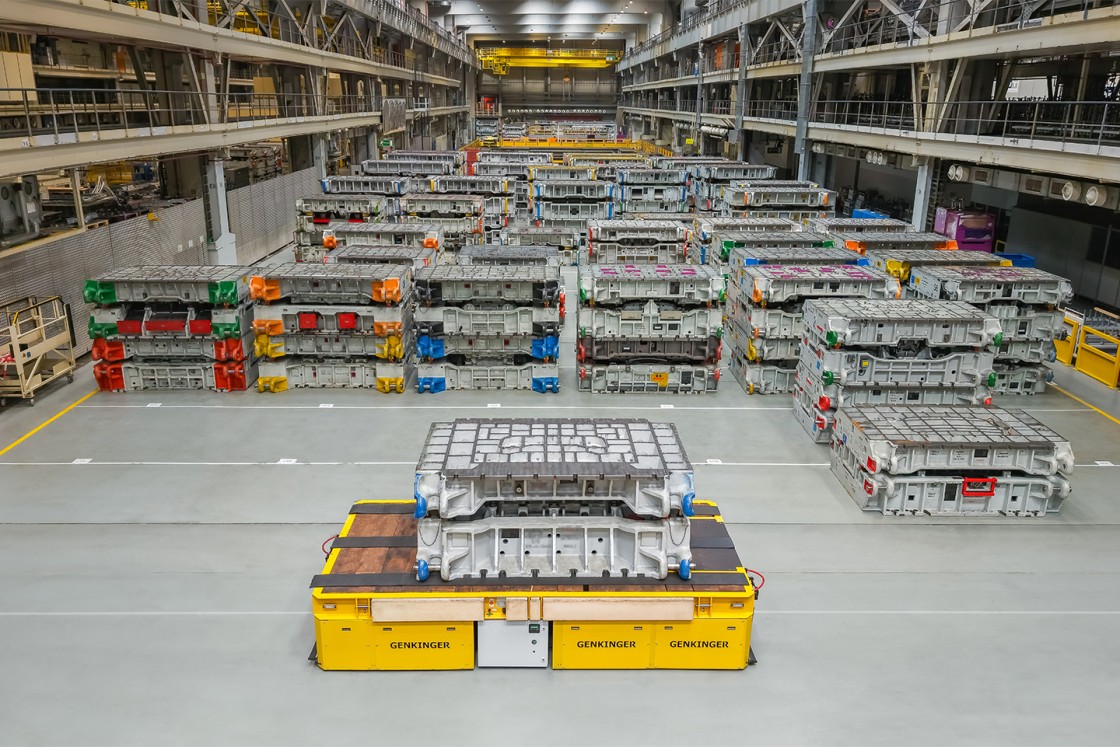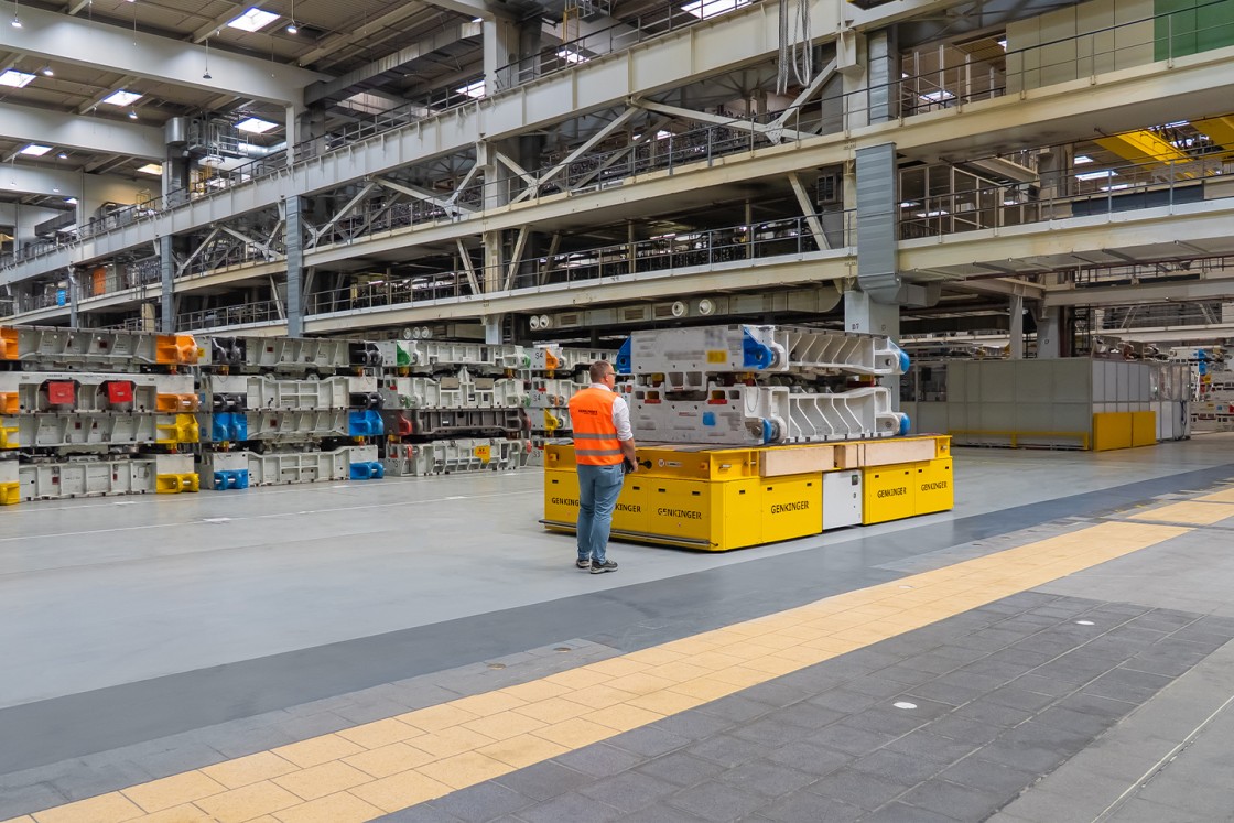 Die Presswerkzeuge werden mithilfe eines Deckenkrans auf den Plattformwagen verladen und anschließend sicher sowie zuverlässig über die Distanz zwischen zwei Hallenschiffen zu den jeweiligen Fertigungslinien des BMW Group Standort Dingolfing transportiert. Dank der induktiven Spurführung im Fußboden folgt der Wagen exakt seinem vorgegebenen Fahrweg. Die Steuerung erfolgt komfortabel per Fernbedienung, wodurch der Materialfluss schnell und sicher gewährleistet ist.