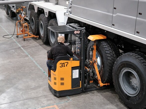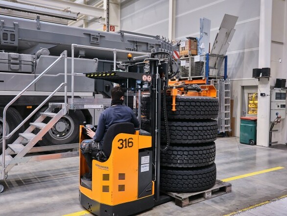 Die Rädermontage für bis zu neunachsige Fahrzeuge eines weltweit führenden Kranproduzenten laufen mit Rädermanipulatoren, deichsel- geführt oder als Fahrersitz-Ausführung, schnell und sicher ab: