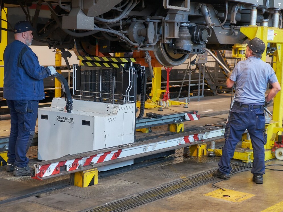 S-Bahnen müssen regelmäßig gewartet werden – Genkinger Flurförderzeuge helfen dabei. Damit die Bahnen wieder schnell auf die Schienen kommen, wird in den Betriebswerken, dem Herz der S-Bahnen oft rund um die Uhr repariert, getestet und gereinigt. Anders als bei Straßenfahrzeugen werden bei S-Bahnen nicht einzelne Räder gewechselt, sondern kompletteRadsätze. Um den dazugehörigen Prozess schneller und sicherer zu machen, wurden zwei Genkinger Spezialfahrzeuge entwickelt. Ein Fahrzeug nimmt den abgenutzten Radsatz unter dem hochgehievten Zug heraus, während das zweite Fahrzeug schon mit dem neuen Radsatz parat steht. Die Größe der beiden Genkinger Fahrzeuge ist so bemessen, dass sie genau zwischen die Schienen passen. Die zwingend notwendige niedrige Bauhöhe wurde mit einem Vollfreihubmast erreicht. Ein feinfühliger Antrieb positioniert das Fahrzeug millimetergenau; der Seitenschub unterstützt beim Justieren der Montageposition. Auch das Ein- und Auslagern der Radsätze aus den Regalen erledigt das Flurförderzeug-Duo präzise und sicher. Der Radwechsel läuft für die Beschäftigten komplett stressfrei ab .