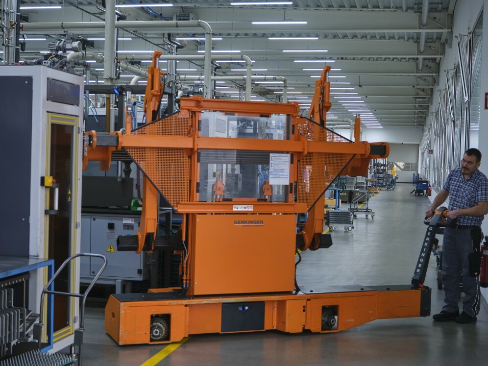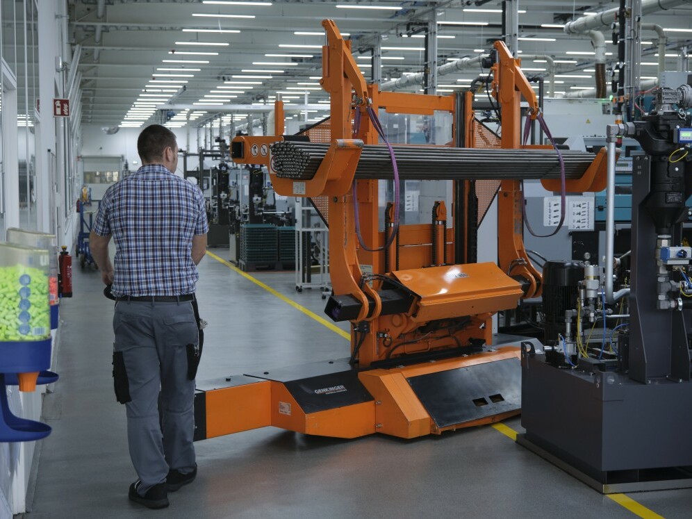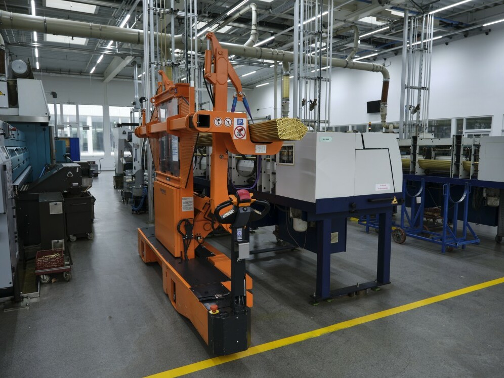 Für eine effiziente und unterbrechungsfreie Produktion werden Drehautomaten oft mit Magazinen für die Rohmaterial-Stangen ausgerüstet. Um Platz zu sparen, werden die Drehmaschinen sehr eng angeordnet und über die Versorgung mit Rohmaterial wird sehr oft erst im zweiten Schritt nachgedacht. Der schmale Stangenmanipulator von Genkinger ist ein ideales Fahrzeug, um in den engen Gängen zwischen den Maschinen zu operieren. Die Vorteile für den Kunden sind: