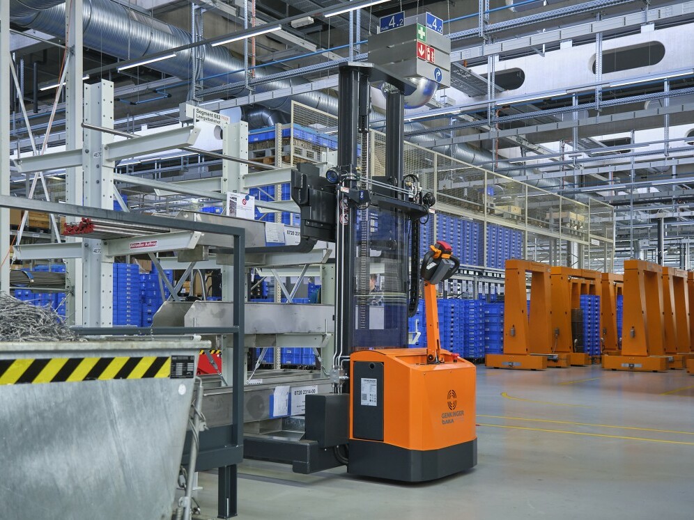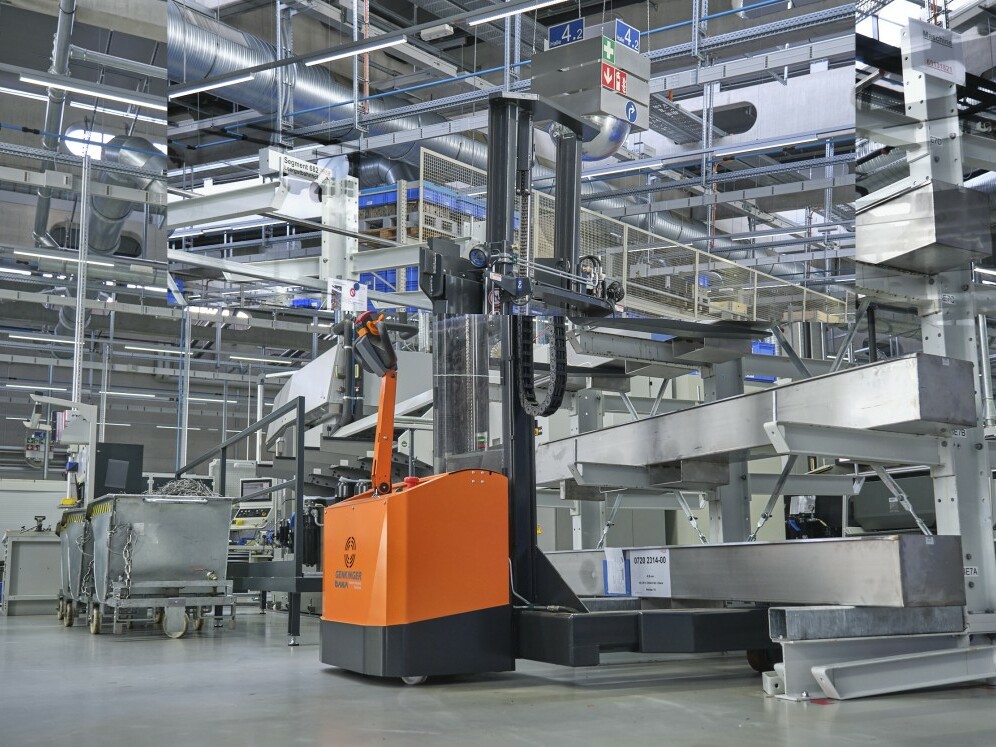 Vor ein paar Tagen haben wir einen EGPL ausgeliefert und unseren Kunden HAWE Hydraulik im WerkKaufbeuren in die Benutzung eingewiesen. Hinter dem Kürzel EGPL verbirgt sich ein besonderer ↕ ↔ 4-Wege-Hochhubwagen. Dieses kompakte Gerät erlaubt es, auf kleinstem Raum Langgut wie Stäbe, Profile oder Rohre umzuschlagen. Diese Kompaktheit ist bauartbedingt, da kein Kontergewicht benötigt wird. Eingesetzt werden diese Fahrzeuge beispielsweise, um Drehautomaten mit Rohmaterial – Langgut – zu versorgen. Nach der Verarbeitung können kurze Teile mittels Palette weitertransportiert werden.